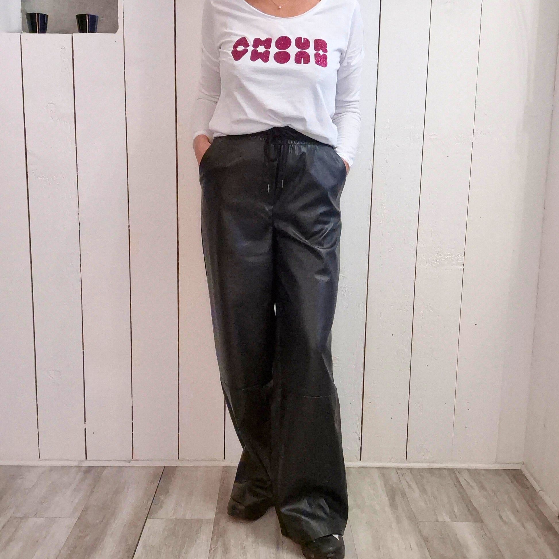 Ce pantalon large en simili cuir allie confort et style. Sa taille élastique avec cordon assure un ajustement parfait tout au long de la journée, tandis que la matière apporte une touche moderne et élégante. Idéal pour un look à la fois décontracté et tendance, il vous accompagnera avec aisance dans toutes vos occasions.