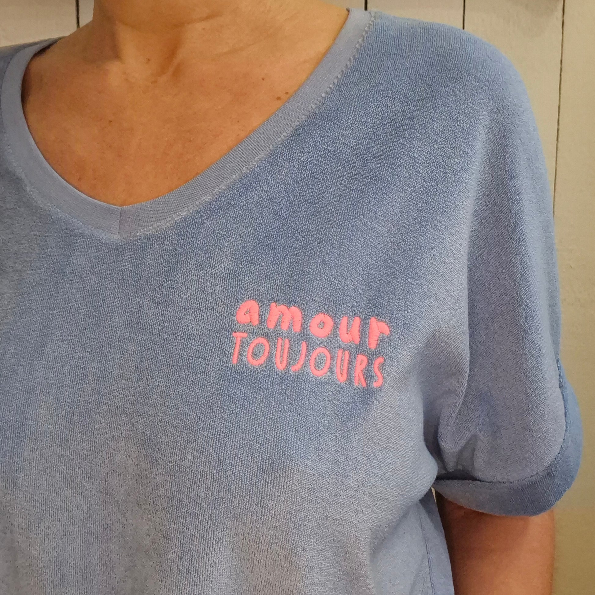 T-shirt manches longues en tissu éponge ultra-doux et confortable pour vos journées détente. Son col V élégant offre une silhouette affinée, tandis que la broderie fluo apporte une touche d'originalité et de pep's à votre look. Parfait pour se sentir bien dans sa peau, ce basique incontournable se porte facilement au quotidien, seul ou en superposition. Une pièce qui vous accompagne avec style et douceur.
