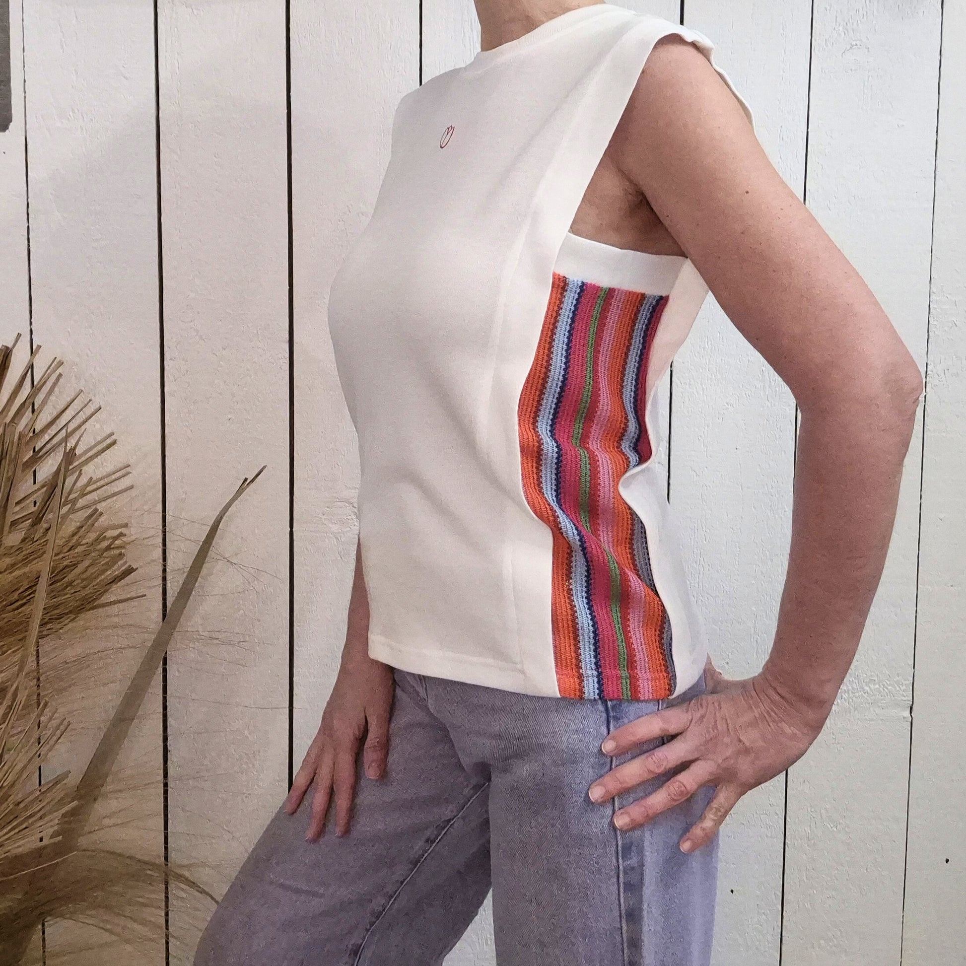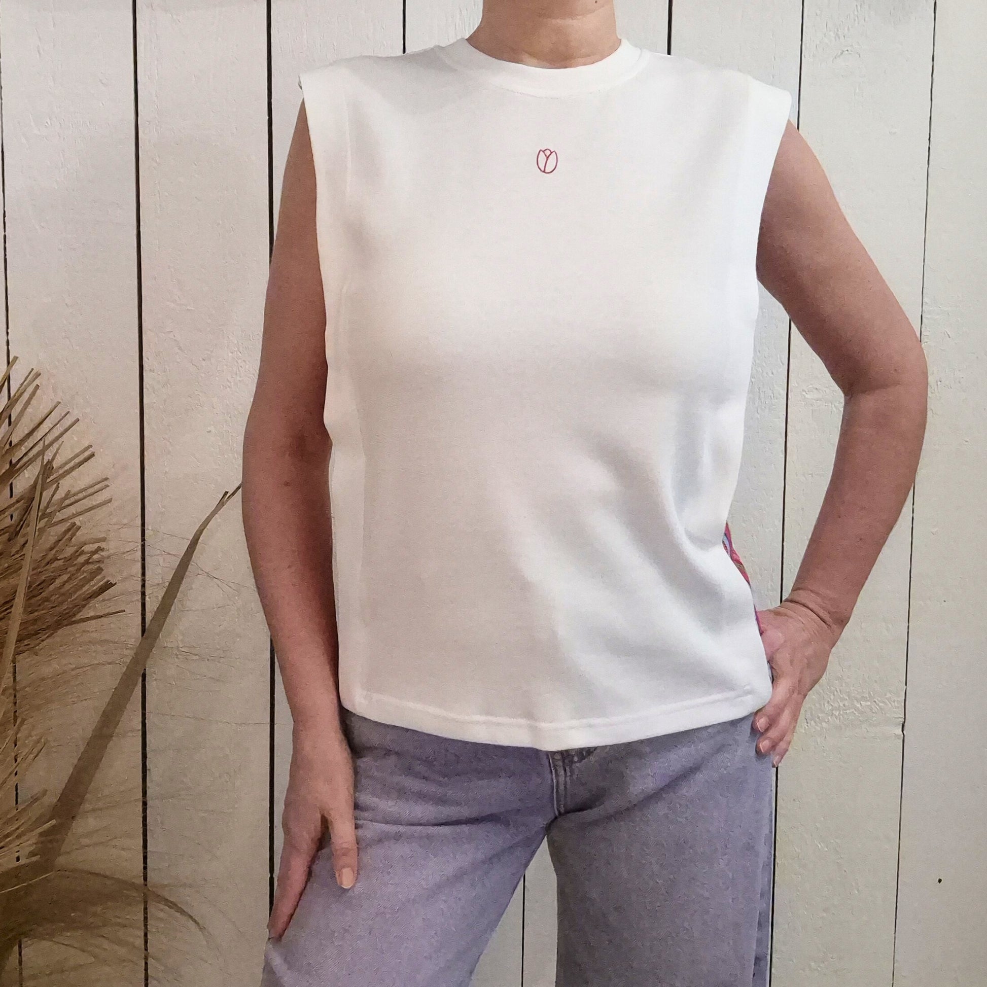 T-shirt sans manches avec empiècement coloré qui apporte une touche de dynamisme à votre garde-robe. Parfait pour les beaux jours, ce basique revisité combine confort et style. L'empiècement contrasté crée une silhouette flatteuse et permet de jouer facilement avec vos accessoires. Idéal pour les looks décontractés comme pour les occasions plus habillées.